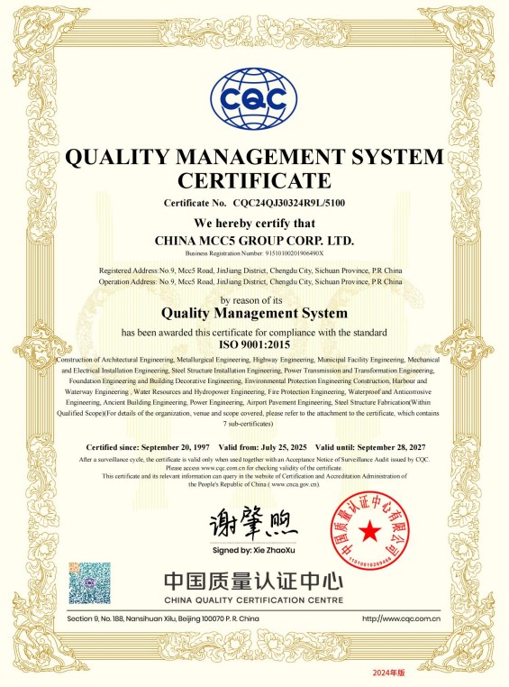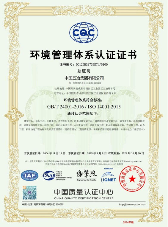 中國五冶集團有限公司(以下簡稱中國五冶集團),1997年通過ISO9000質量體系認證。2004年,中國五冶集團按照ISO9001、ISO14001、OHSAS18001國際標準要求,建立質量環境職業健康安全整合型管理體系并通過三標一體認證。2011年,中國五冶集團按照GB/T50430-2007《工程建設施工企業質量管理規范》要求,建立并通過質量環境職業健康質量管理規范的三標一規范體系認證,至今保持三標一規范管理體系連續、平穩和協調運行。