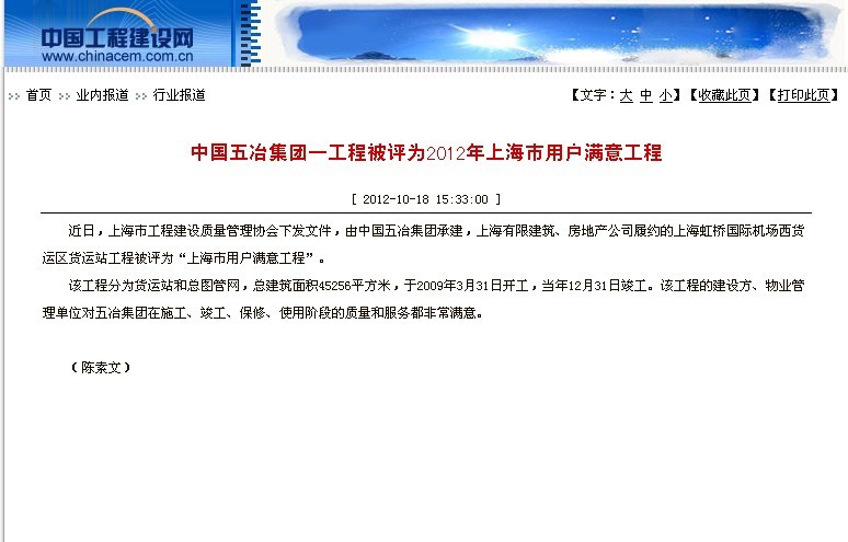 中國工程建設(shè)網(wǎng)報道:中國五冶集團一工程被評為2012年上海市用戶滿意工程