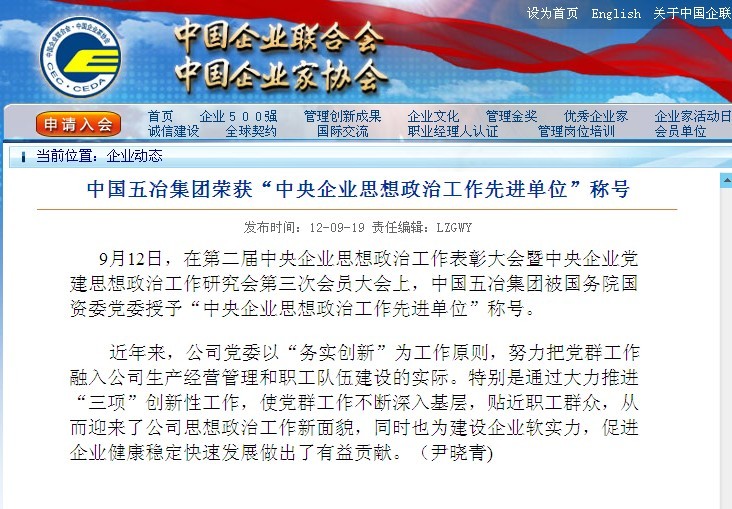 中國企業(yè)聯(lián)合網(wǎng)報(bào)道:中國五冶集團(tuán)榮獲“中央企業(yè)思想政治工作先進(jìn)單位”稱號(hào)