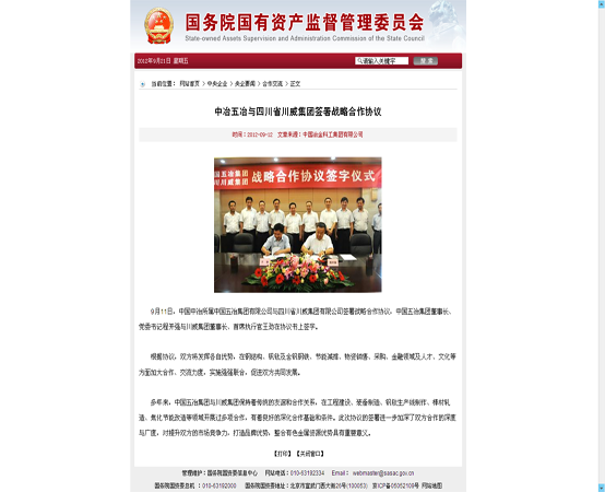 國資委報道:中冶五冶與四川省川威集團簽署戰略合作協議