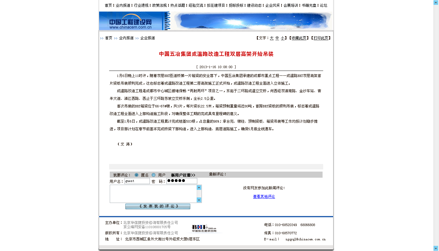 中國工程建設網報道:中國五冶集團成溫路改造工程雙層高架開始吊裝