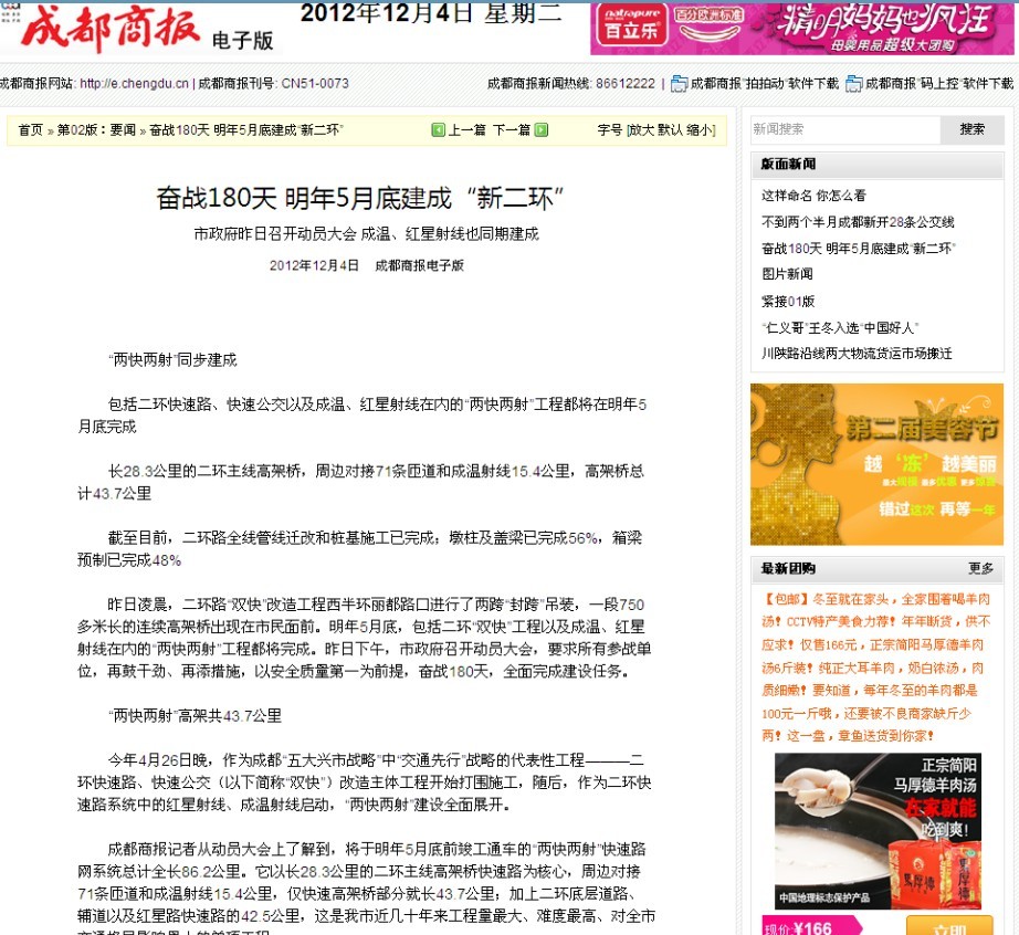 成都商報報道:奮戰180天 明年5月底建成“新二環”