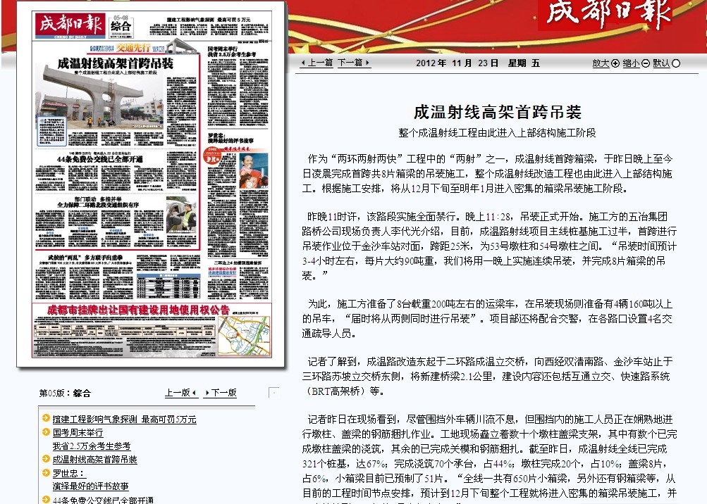 成都日報報道:成溫射線高架首跨吊裝