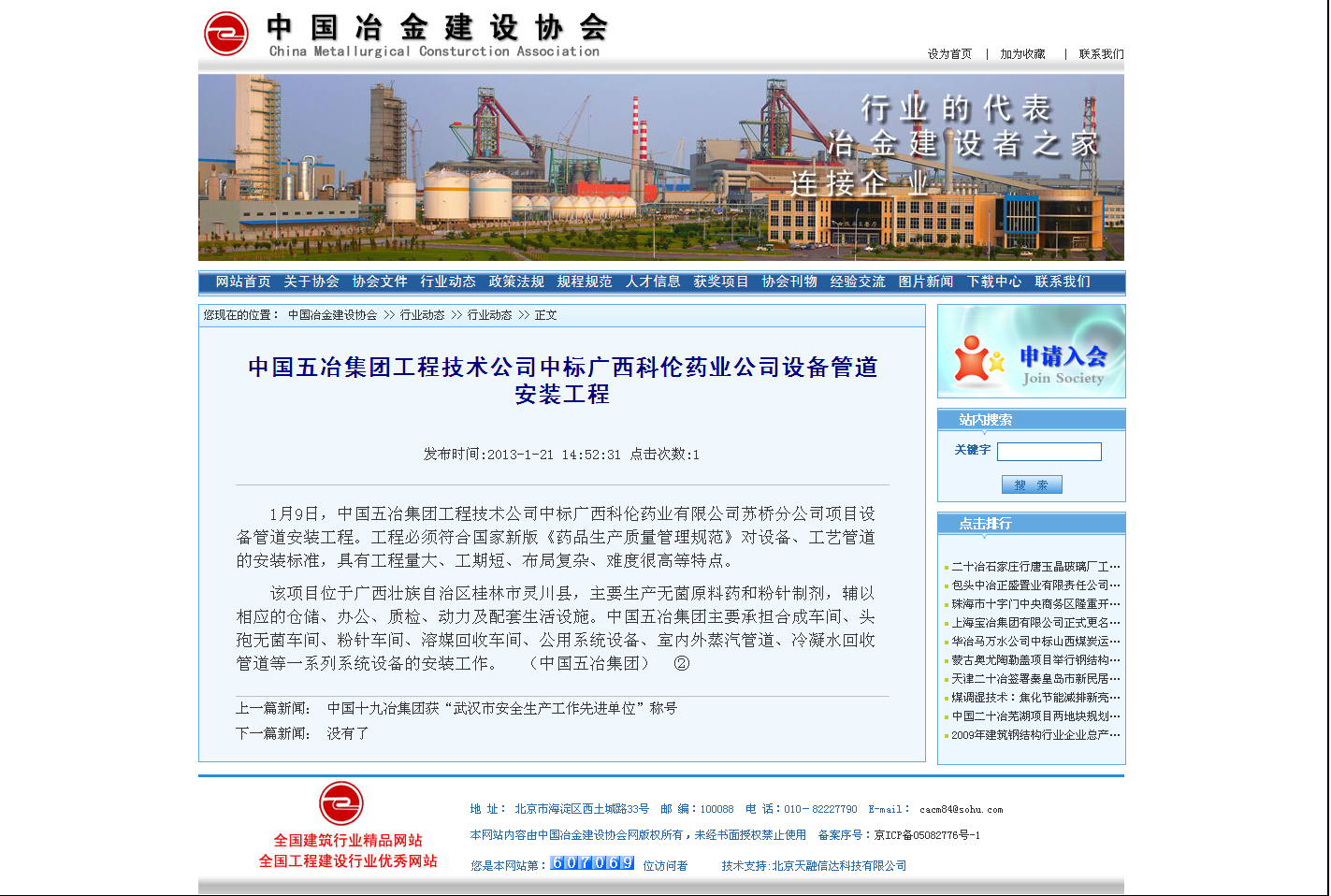中國冶金建設協會報道:中國五冶集團工程技術公司中標廣西科倫藥業公司設備管...