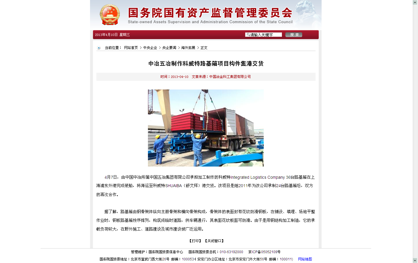 國資委報道:中冶五冶制作科威特路基箱項目構件集港交貨