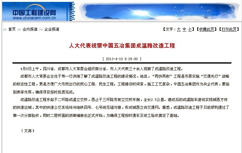 中國工程建設網(wǎng)報道:人大代表視察中國五冶集團成溫路改造工程