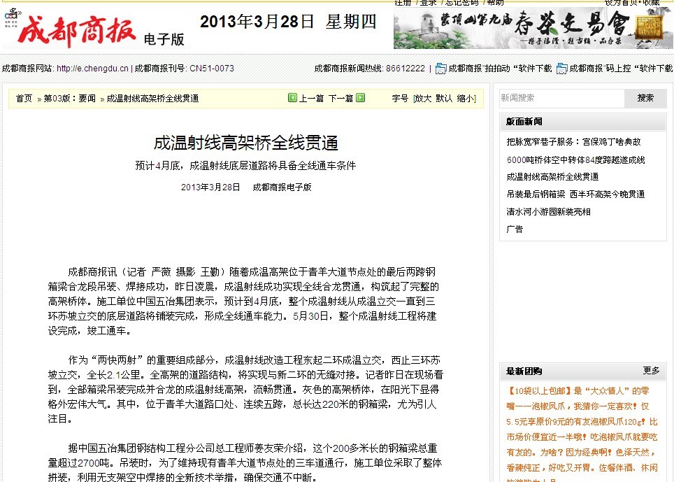 隨著成溫高架位于青羊大道節(jié)點處的最后兩跨鋼箱梁合龍段吊裝、焊接成功,昨日凌晨,成溫射線成功實現(xiàn)全線合龍貫通,構筑起了完整的高架橋體。施工單位中國五冶集團表示,預計到4月底,整個成溫射線從成溫立交一直到三環(huán)蘇坡立交的底層道路將鋪裝完成,形成全線通車能力。5月30日,整個成溫射線工程將建設完成,竣工通車。