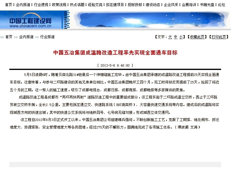 中國工程建設(shè)網(wǎng)報道:中國五冶集團成溫路改造工程率先實現(xiàn)全面通車目標(biāo)