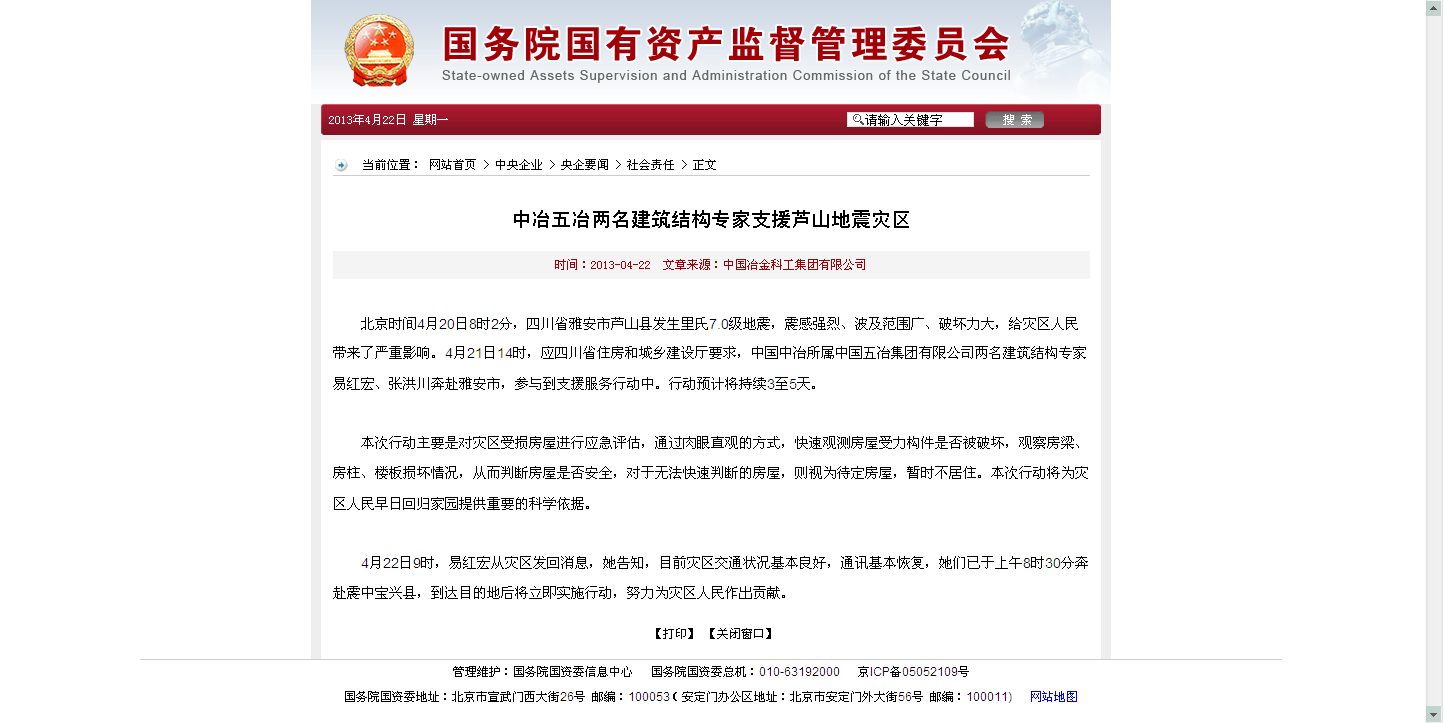 國資委報道:中冶五冶兩名建筑結構專家支援蘆山地震災區