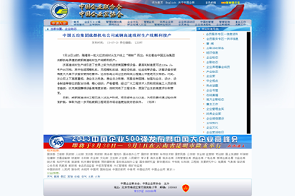 中國企業聯合會報道:中國五冶集團成都機電公司威鋼高速線材生產線順利投產