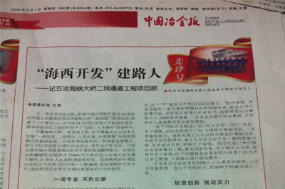 5月1日,《中國冶金報》第八版發(fā)表題為《“海西開發(fā)”建路人——記五冶海峽大橋二線通道工程項目部》的報道,報道了中國五冶集團(tuán)海峽大橋二線通道工程項目部,榮獲中華全國總工會授予的“全國工人先鋒號”榮譽(yù)稱號,在整個工程中的勇于拼搏、善于創(chuàng)新精神。