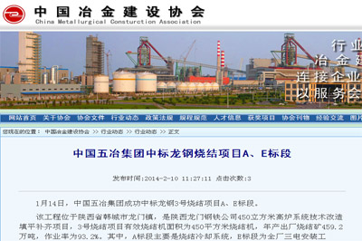 中國冶金建設協會報道:中國五冶集團中標龍鋼燒結項目A、E標段