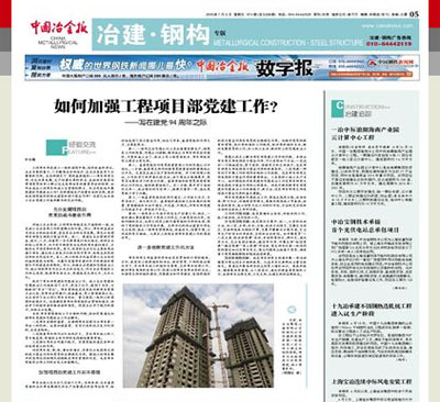 7月3日,中國冶金報第5版(冶建?鋼構(gòu)專版)報道:由五冶集團(tuán)上海有限機(jī)械化公司承建的云南昆明昆鐵家園一標(biāo)段住宅小區(qū)工程A棟主體結(jié)構(gòu)封頂,比業(yè)主要求工期提前將近1個月時間。項目部狠抓管理,確保施工的進(jìn)度、安全、質(zhì)量。標(biāo)志著機(jī)械化公司的市政、交通、民建產(chǎn)品的經(jīng)營能力有新的提升。