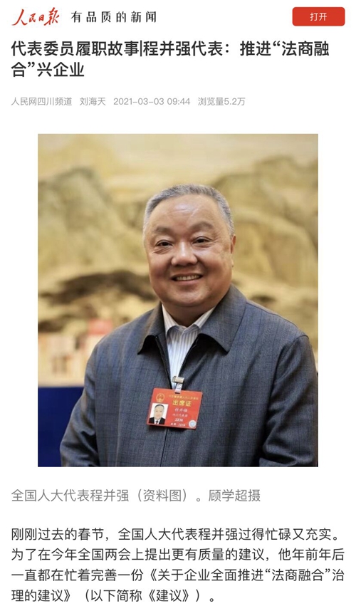 3月2日,人民網(wǎng)聚焦了程并強(qiáng)代表關(guān)于“關(guān)于企業(yè)全面推進(jìn)‘法商融合’治理”的議案建議。